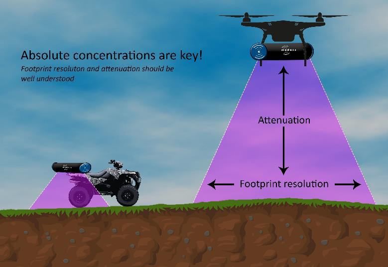 Figure 1: Difference in viewing area between ground and drone measurements. Due to the increase in elevation the effective spot size on the ground increases. At the same time due to the increased layer of air between the ground and the detector the signal will deteriorate.