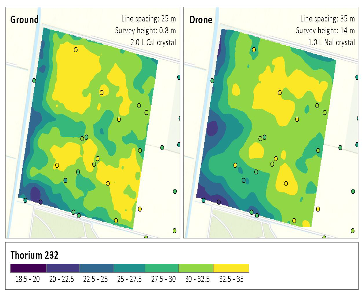 Figure 2: Comparison of the resulting 232Th concentrations for ground and drone measurements, the detector is placed at 0.8 and 14 meter height above the ground respectively. Note that the absolute concentrations match and the resolution of the drone measurements decreased. This deterioration is expected due to increase in distance from the ground resulting in an inevitable loss in resolution (see figure 1). The circles represent the soil samples that have been analyzed in the laboratory.