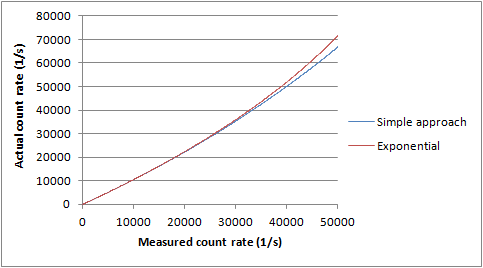The latter formula can only be solved numerically, so the first equation is often used instead. The figure below shows the first equation gives a very good approximation for low count rates (graph depending on the deadtime per count, of course):