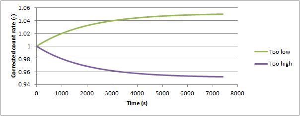 The last equation should give a constant value for Rr(0), for all values of t. Using a series of measurements and a best fit approach (using for example MS Excel), this should give a value of τ which best describes the dead time per count in the system.