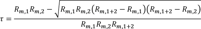 Rr,1 = Rm,1 / (1 - Rm,1 * τ), Rr,2 = Rm,2 / (1 - Rm,2 * τ) and Rr,1+2 = Rm,1+2 / (1 - Rm,1+2 * τ)