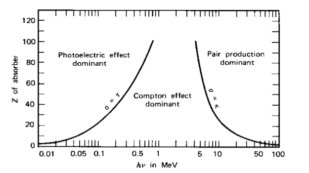 The fact that the Compton cross-section is independent of the atomic number Z, indicates that, contrary to the photo-electric effect, Compton scattering is more or less independent of the medium. The inverse relation with the photons energy indicates that Compton scattering is dominant at higher energies (~0.5-5 MeV).