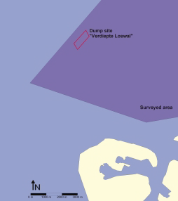 The National Institute for Coastal and Marine Management of the Dutch Ministry of Public Transport and Water Management (RIKZ/RWS) has initiated a monitoring project around the Verdiepte Loswal. Prior to dumping of dredge spoil, the site is mapped with MEDUSA and with a multibeam system. This survey serves as a baseline measurement for future studies and has been used to investigate the texture and morphology of the studied area. Figure 2 shows the geographical situation of the harbour mouth, the dumpsite and the surveyed area. The survey was carried out in four days and comprises about 120,000 data points distributed over 90km2. Figure 3 shows sludge concentration and morphology in the survey area. The increased concentrations of sludge in the area east of the gravel pits (Verdiepte Loswal) originate from an abandoned dumpsite further north.