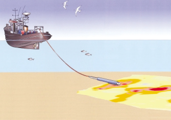 Successive measurements of water depth with, for example, a multibeam system, may be used to determine changes in morphology. The uncertainty of these determinations (typically 15cm in depth) prohibits the monitoring of dispersion of sediments from an underwater depot over large areas. The recent development of the ‘MEDUSA’ detector system is a result of a longstanding research programme aimed at developing geophysical methods providing quantitative information on sediment composition. With this system, it has become possible to measure small changes in composition of the top layer of the sediment. MEDUSA is a detector system that utilises variations in the content of natural radionuclides between sediments. It is towed over the sediment behind a vessel (Figure 1) and determines the sediment composition (e.g. sludge concentration) and density each second. The system has been operated on various types of vessels in water depths ranging from 0.5m to 5km and can be used simultaneously with other monitoring devices such as echo sounder or multibeam. The towing speed is up to 10km/h. Data obtained with the system provides maps with: