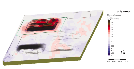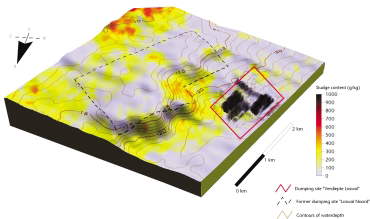 Transport of the sludge from the dumping site is quantified with a difference map (Figure 5), which in the 3D view shows the increase in volume and with colours the increase in sludge content of the sediment. These results show that the increase in sludge concentration on the dumping site coincides with the increase in bed height. Around the dumping site clays are dispersed to a maximum of 250 metres (denoted by the green rectangle). The variations of ~300g/kg in the other part of the area are the result of natural variations resulting from continuous transport of fine sediments at sea. With the information gathered during the two measurement campaigns, a mass balance is constructed that has been used to validate the results of model calculations. This quantitative information on the transport of sediment can help to refine models for an improved assessment of the effectiveness of a spoil depot.