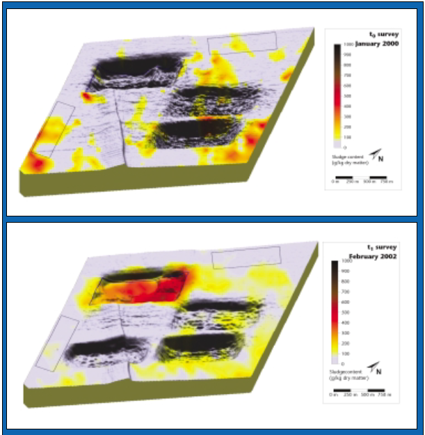 Figure 4 shows sludge distribution in the area around the dumping site (blue rectangle) prior to dumping (t│ measurement) and after two years of use (t│ measurement). Between the surveys, 4.3 billion kilos (dry weight) sludge was dumped in the first pit, 500m wide and 1,250m long. At t│ the dumping site does not contain any sludge. The concentrates of sludge in the other parts of the area originate from a former dumpsite. At t│ dumping of harbour sludge may be clearly recognised by increased sludge concentration in the former gravel pit. Dispersal from the gravel pit is little; sludge extends only 250m around the sides of the pit.
