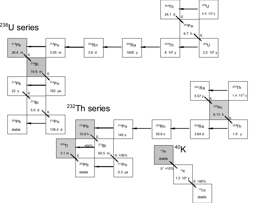 The decay chains of the three naturally occurring radionuclides are presented in the figure above. The emission of β-particles is denoted by diagonal lines, emission of 𝛼-particles occurs along the horizontal lines. The most relevant 𝛾-ray emitters are denoted by the grey boxes. For each nuclide, the half-life time is given. As can be seen, the half-lifes, and therefore the concentrations of the members of the decay series vary by a factor of 1015. Most of the members can therefore only be measured by radioactive decay since the concentrations are too low for chemical analyses .
