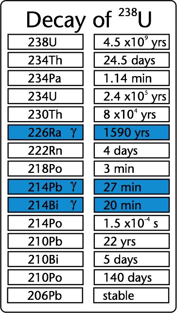 Not all nuclei present in the decay chain emit 𝛾-rays. For the 238U series, the most important 𝛾-ray emitters are 214Pb and 214Bi and for the 232Th series, 228Ac, 212Pb and 208Ti. This means that concentrations of 238U and 232Th can be measured indirectly by the concentration of 𝛾-ray emitters from the decay chain provided that secular equilibrium is present. The breaking of secular equilibrium is mainly a concern in the 238U series. The decay series of 238U contains a radium isotope, soluble in water (226Ra) with a half-life time of 1600y. The next decay product is Radon (222Rn), which is a noble gas and has the possibility to escape the medium. If the system in which the measurements take place is not a closed system, which means that nuclei disappear not only due to radioactive decay, and radium and or radon can escape. Measuring g-rays from 214Pb and 214Bi will therefore underestimate the 238U concentration. To determine this effect of dis-equilibrium in sediment, concentrations of 238U in a zircon sample were measured with X-ray fluorescence, whilst the concentration of 214Bi was measured by g-ray spectroscopy. The results were compared and within the uncertainties, there were no indications that the systems were not closed (de Meijer et al., 1997), although it is known that 20-30% of radon formed in dry quartz sand does escape (van der Spoel, 1998). In water saturated conditions, radon remains close to its locations of formation and secular equilibrium is assumed.