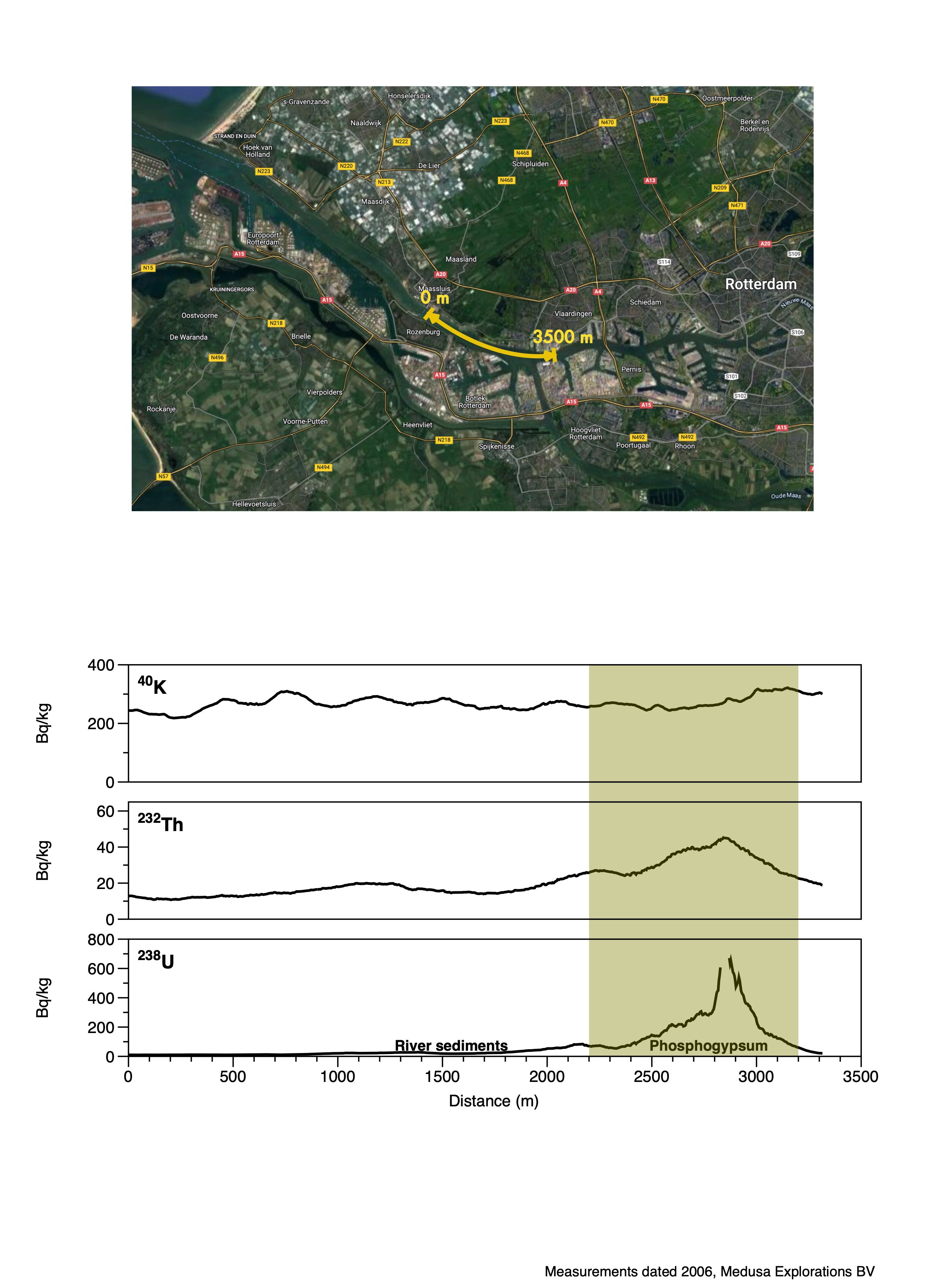 The figure illustrates measurements taken from the "nieuwe waterweg" site, which was previously home to a fertilizer factory. The data clearly demonstrates the elevated levels of uranium-238 (238U) in the sediment, attributed to the presence of Phosphogypsum.