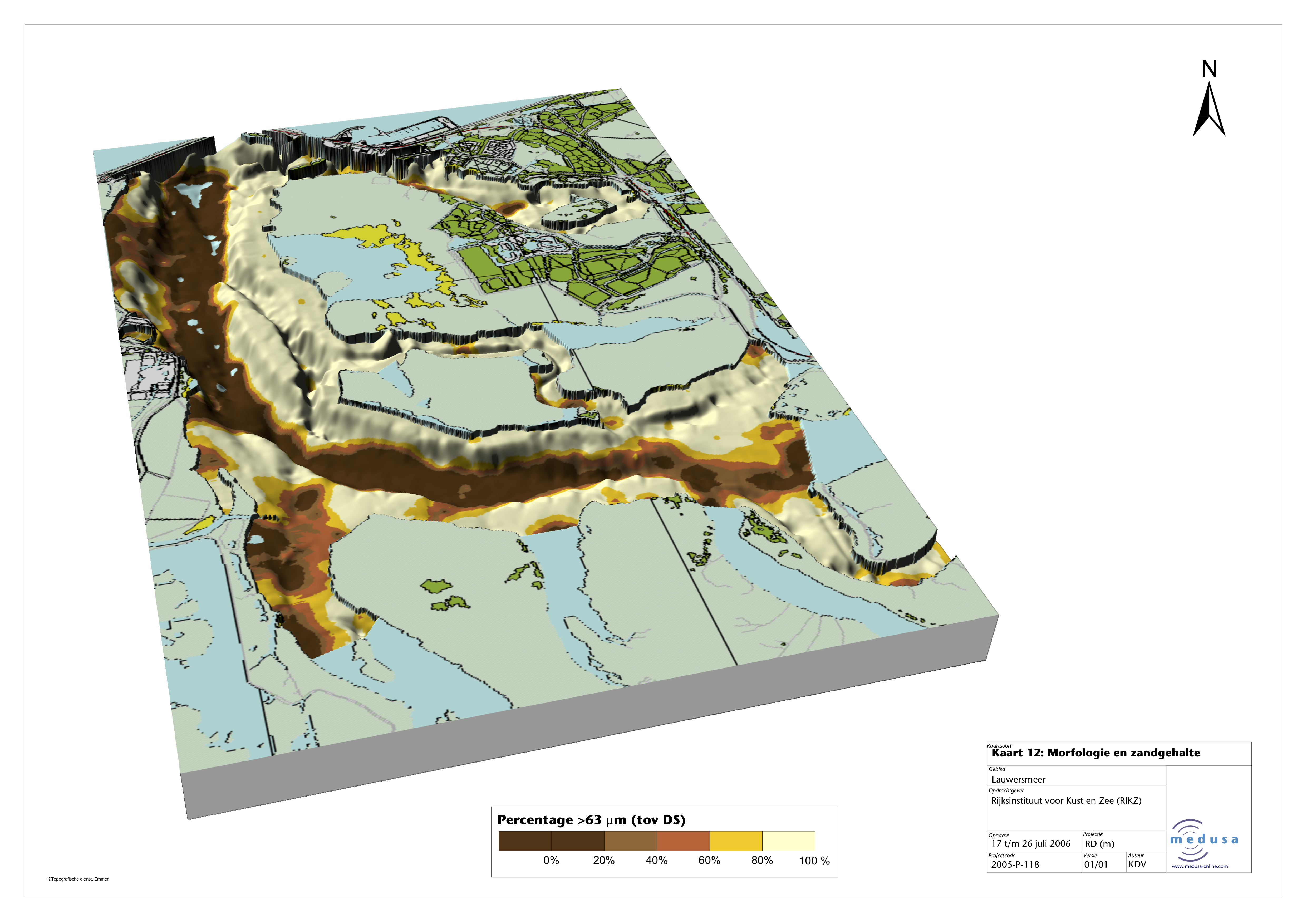 The map shows the sand content of the sediments in the Lauwersmeer in the Netherlands, a former tidal channel that is closed by a dam. The map of the sand content is draped over the morphology that was simultaneously measured with a multibeam system. The combined map clearly shows how fine material is settled in the deeper parts of the former tidal channel.