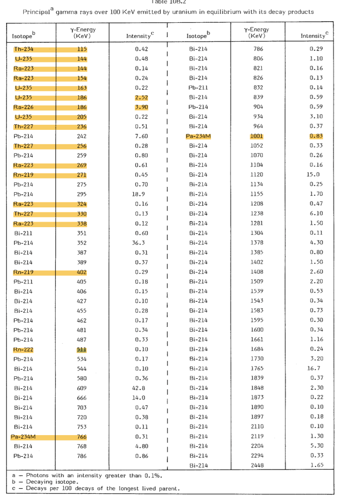 (Table taken from Grasty RL (1979) Gamma Ray Spectrometric Methods in Uranium Exploration - theory and Operational Procedures; in Geophysics and Geochemistry in the Search for Metallic Ores. Geol Sur Canada, Econ Geol Rep 31: 147-161.)
